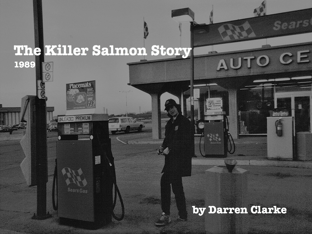 Over the past four months, I’ve handed out forty-three resumes. I hated it every time. Here’s what I boil down to; Matt Chilton, my address, my phone number. I last worked at a Bingo factory operating a mystic, “Pohlar-Mohr Guillotine cutter.” Previously, at the Venture Inn Hotel I, “checked people in, I checked people out.” Finally, I laboured at the Pen Centre mall, “Maintenance/Landscaping.” I have my Grade Twelve diploma, I’ve been involved in my community coaching and refereeing ice-hockey. REFERENCES AVAILABLE UPON REQUEST. What I neglect to mention, what I am about to correct is that for two years, full-time and part-time, I worked at Sears Gas Bar, pumping gas, cleaning the odd windshield, but mainly hanging out with some of my favourite people in the world. It would be at this now extinct gas bar where, “The Killer Salmon Story,” occurred. Dear Sir/Madam- Instead of a less than impressive resume, I give you a story involving a killer fish.